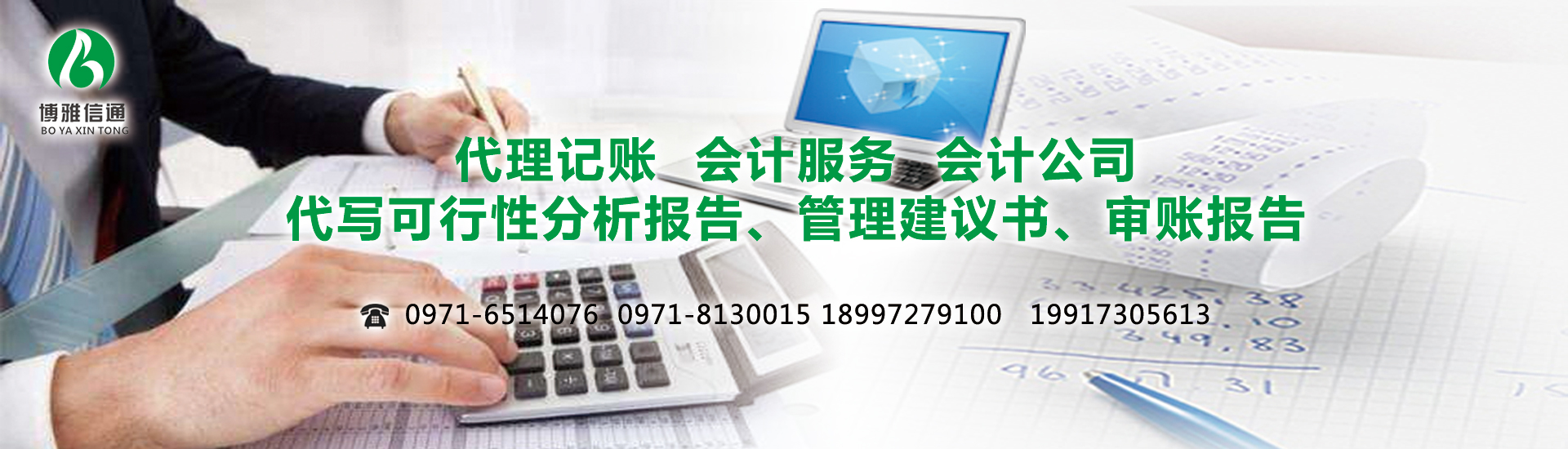 北京博雅信通會(huì)計(jì)服務(wù)有限公司西寧分公司為各中小企業(yè)提供各種專業(yè)工商財(cái)稅會(huì)計(jì)服務(wù)。包括公司設(shè)立籌劃、公司注冊、執(zhí)照變更、代辦注銷、代理記賬報(bào)稅、亂賬整理、會(huì)計(jì)實(shí)操培訓(xùn)、會(huì)計(jì)職稱培訓(xùn)(會(huì)計(jì)取證培訓(xùn))等一站式服務(wù)體系,誠信、專業(yè)、高效、省心! 公司簡介: 北京博雅信通會(huì)計(jì)服務(wù)有限公司西寧分公司 成立于2003年,積累了幾十個(gè)行業(yè)工商財(cái)稅會(huì)計(jì)服務(wù)經(jīng)驗(yàn),主要提供公司注冊、執(zhí)照變更、企業(yè)注銷、工商年報(bào)、代理記賬、納稅申報(bào)、會(huì)計(jì)培訓(xùn)、財(cái)稅顧問等一系列服務(wù)。全程工商財(cái)稅老板們甩手我們代理,并且用足用好工商財(cái)稅優(yōu)惠政策,讓企業(yè)老板省心、省時(shí)、省事兒!節(jié)約會(huì)計(jì)核算和納稅成本,解放您的寶貴時(shí)間抓好企業(yè)經(jīng)營,做您的...